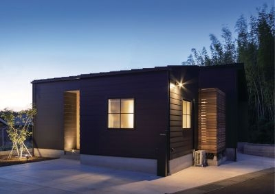 外壁は黒いガルバリウムをベースとし、無垢材のレッドシダーを