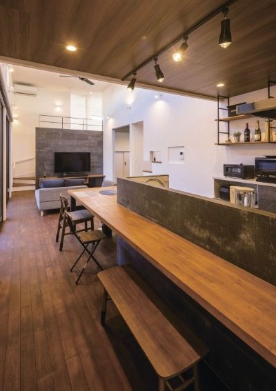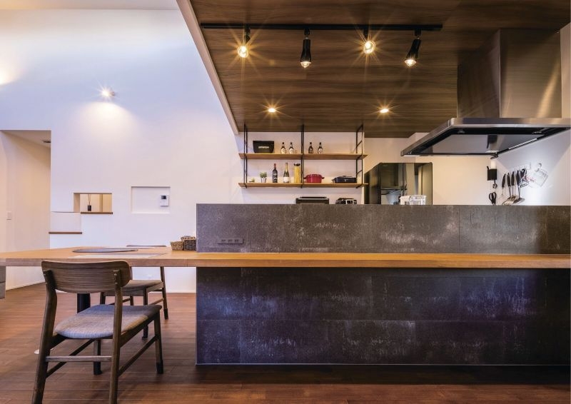 外観の無機質な印象とは対照的に、キッチン部分にはコンクリート素材と木をふんだんに使い